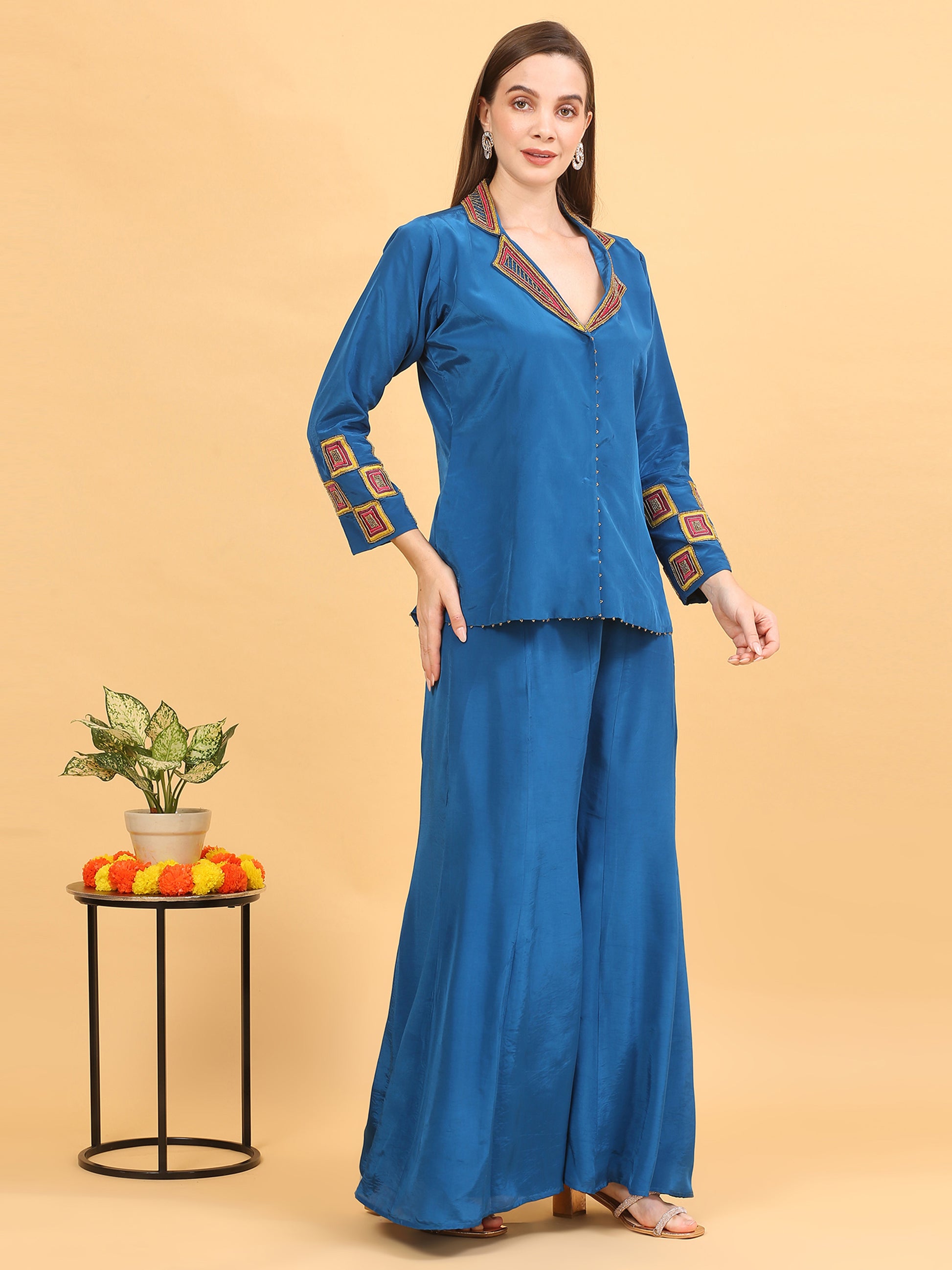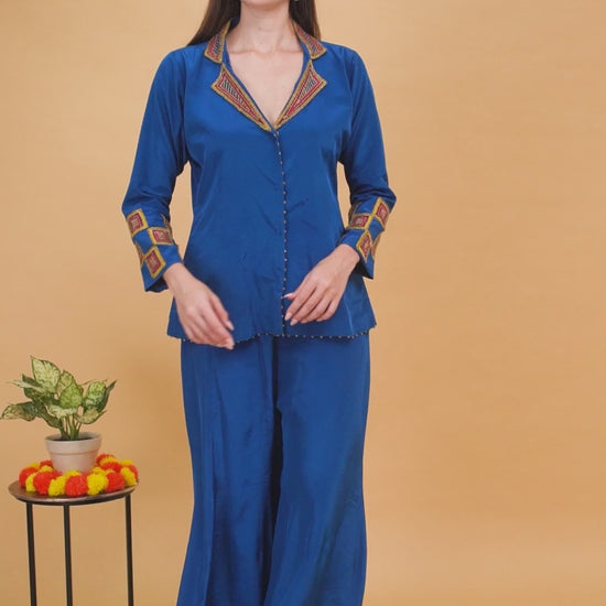 This Outfit Speaks of Power and Grace. It Justifies the Modern Indo Western Look With Structure and Flow Both in the Same Outfit. The Jacket is Beautifully Embellished With Handwork Using Resham and Glass Bead Work. The Geometric Motifs on the Sleeve Give It an Extra Modern Edge. Sharara Pants Are Flowy and Comfortable. Both Jacket and Sharara Are Done on Viscose Crepe Fabric. Both Have a Crepe Lining as Well.