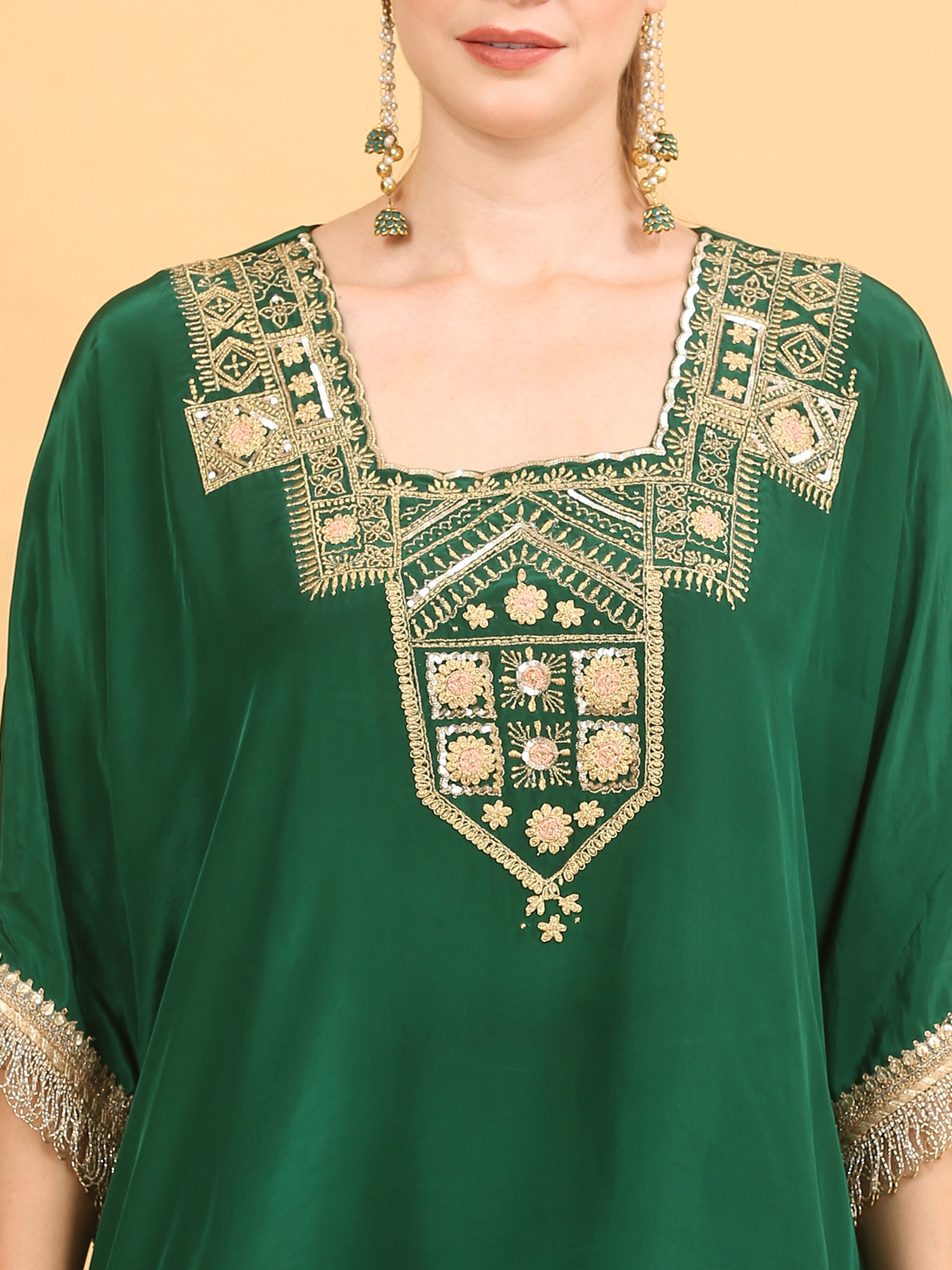 Tradition Meets Modern Vibes. This Emerald Green Kaftan in Viscose Crepe Fabric is Teamed Up With a Flowy Umbrella Cut Sharara. The Neckline is Adorned With Elegant Zari, Sequin and Glass Cutdana Embroidery in a Pattern That Resembles an Art From Ancient Civilization. A Touch of Modernity is Given Using the Gold Zari Kiran Trims on the Sleeve Ends and the Hemline Which is Inverted C Shape.