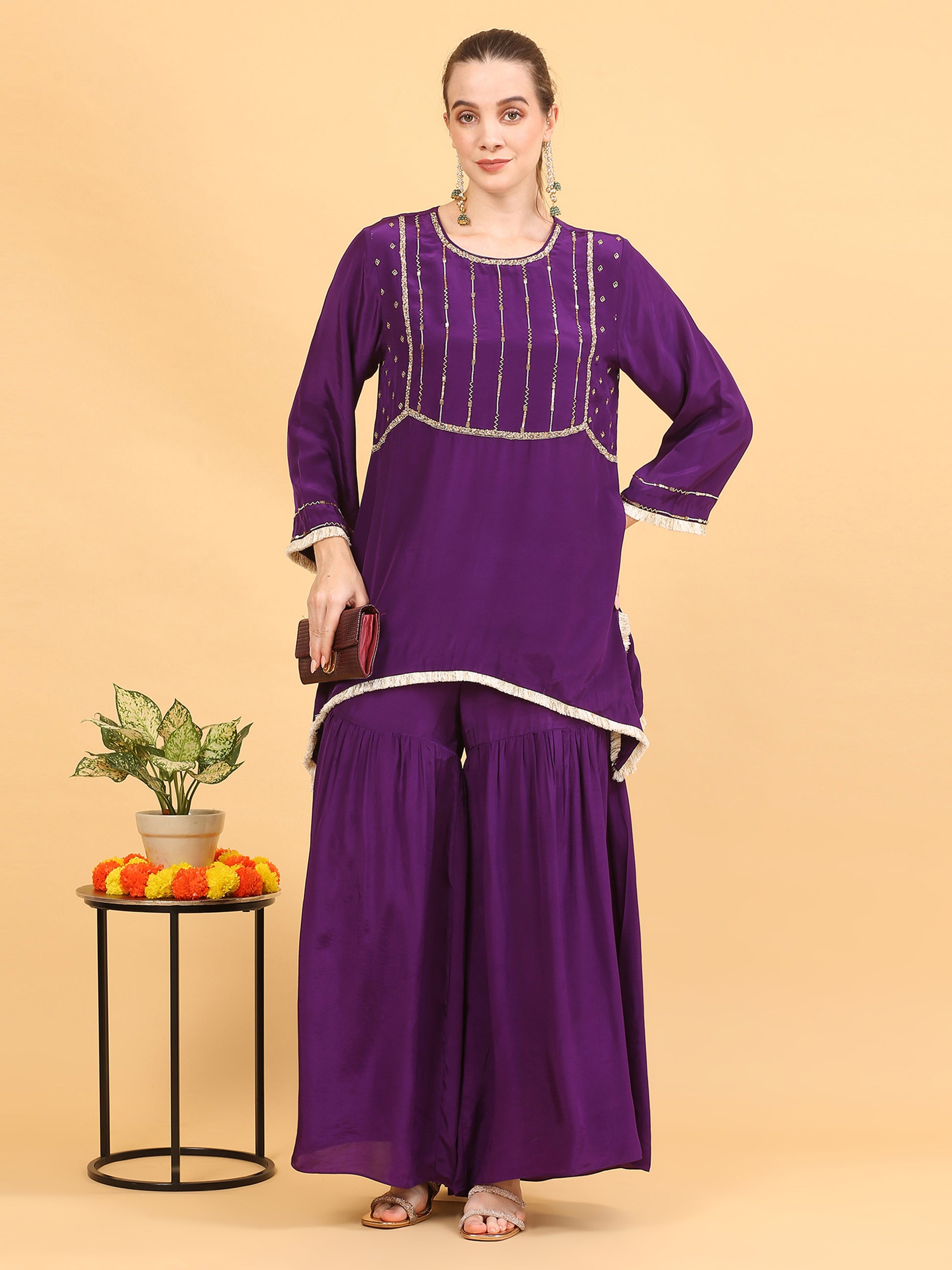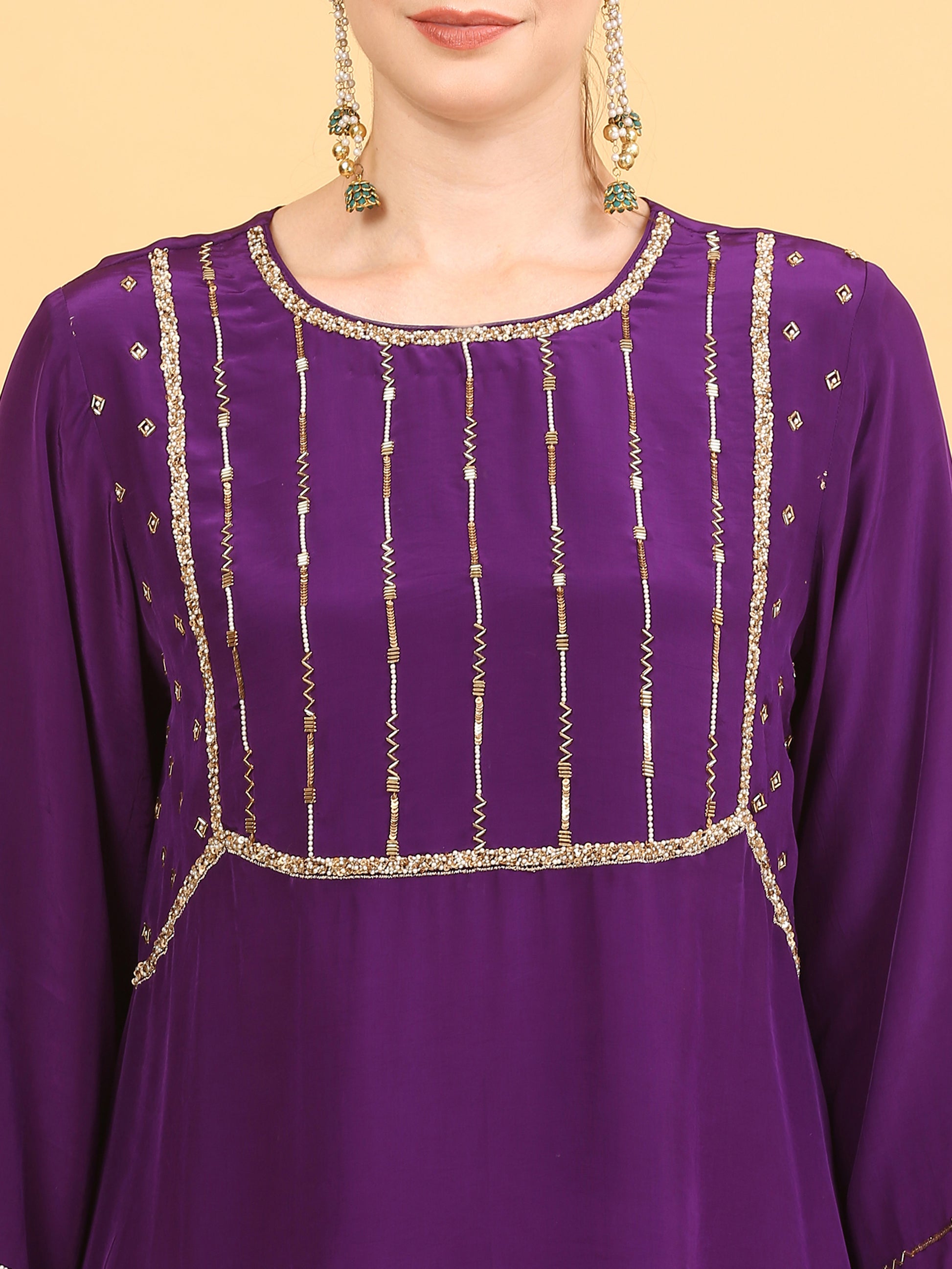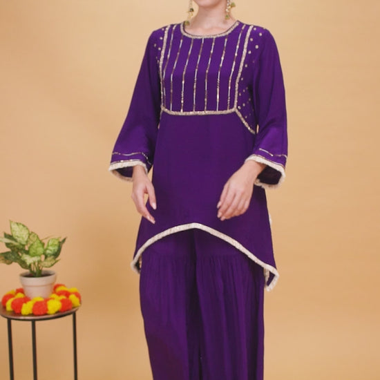 This Deep Purple Kaftan in Viscose Crepe Fabric is All You Need to Uplift Your Mood. The Pakistani Loose Fit Short a-line Kurta is All Hand Worked With Glass Cutdana, Pearl and Shiny Gold Sequins. A Touch of Modernity is Given Using the Gold and Ivory Fringe Trims on the Sleeve Ends and the Hemline Which is Inverted C Shape.