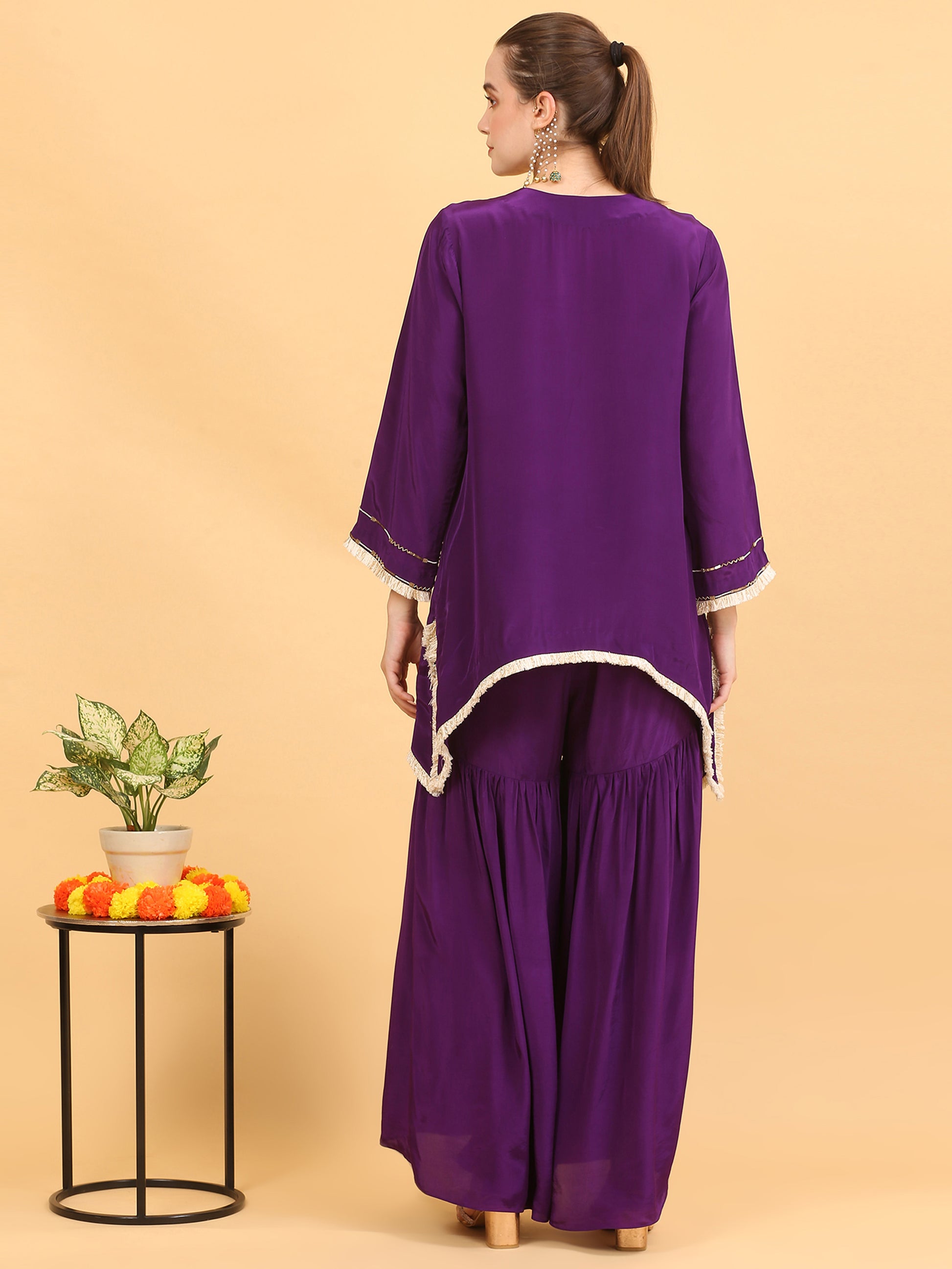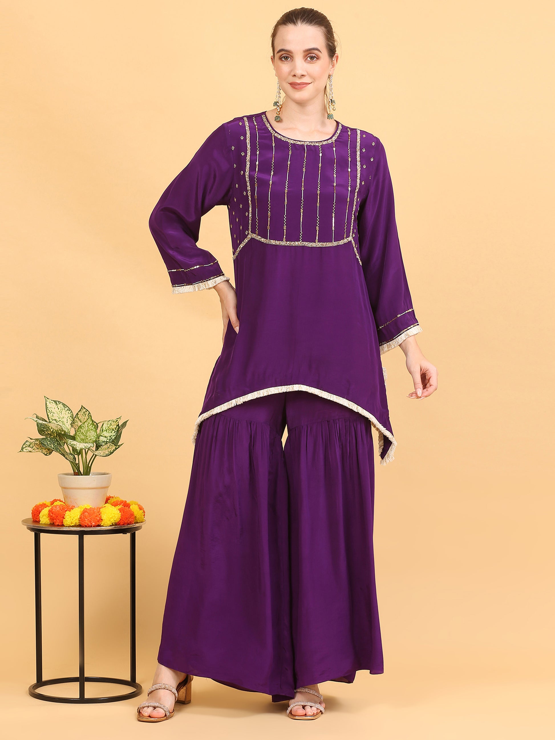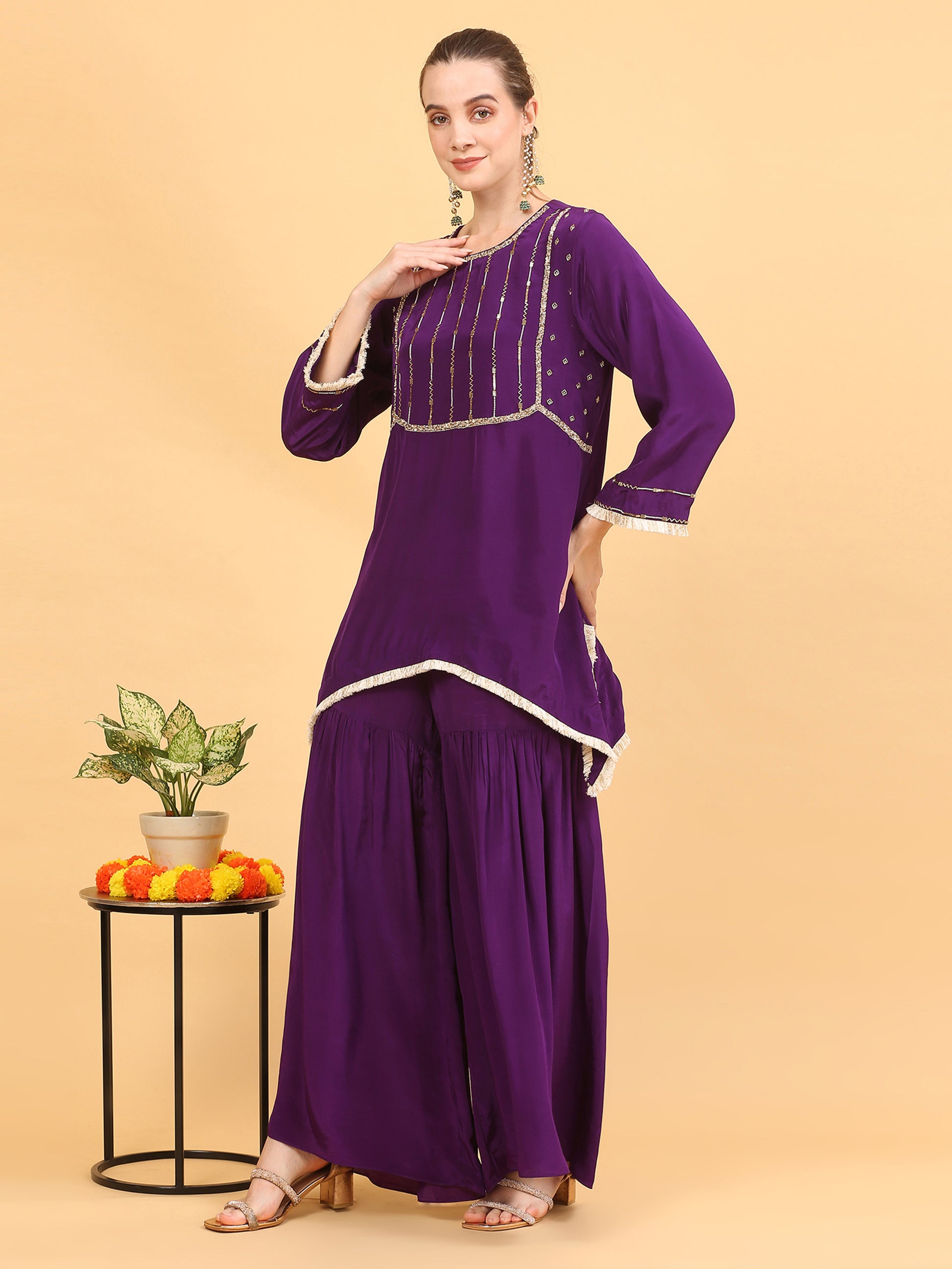 This Deep Purple Kaftan in Viscose Crepe Fabric is All You Need to Uplift Your Mood. The Pakistani Loose Fit Short a-line Kurta is All Hand Worked With Glass Cutdana, Pearl and Shiny Gold Sequins. A Touch of Modernity is Given Using the Gold and Ivory Fringe Trims on the Sleeve Ends and the Hemline Which is Inverted C Shape.